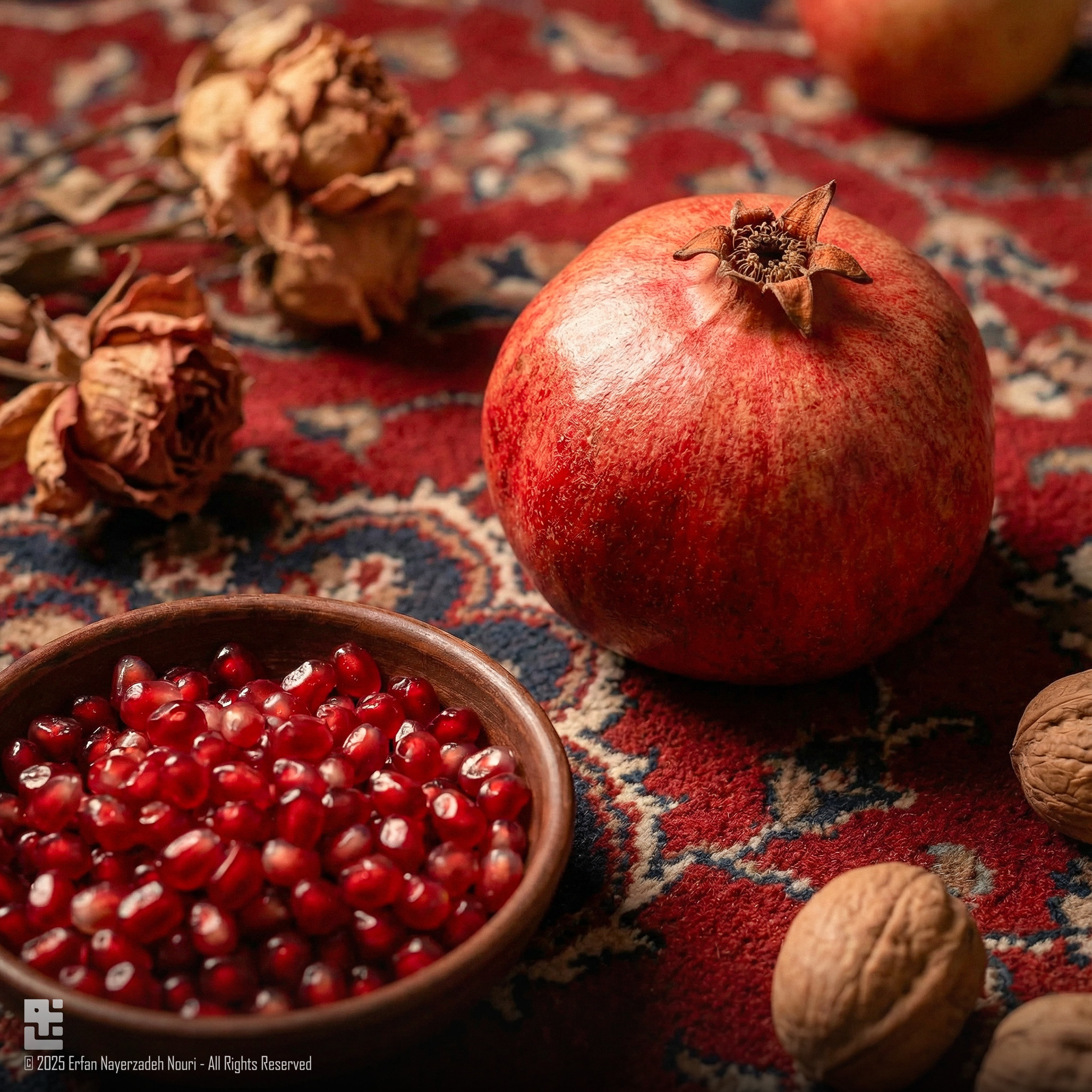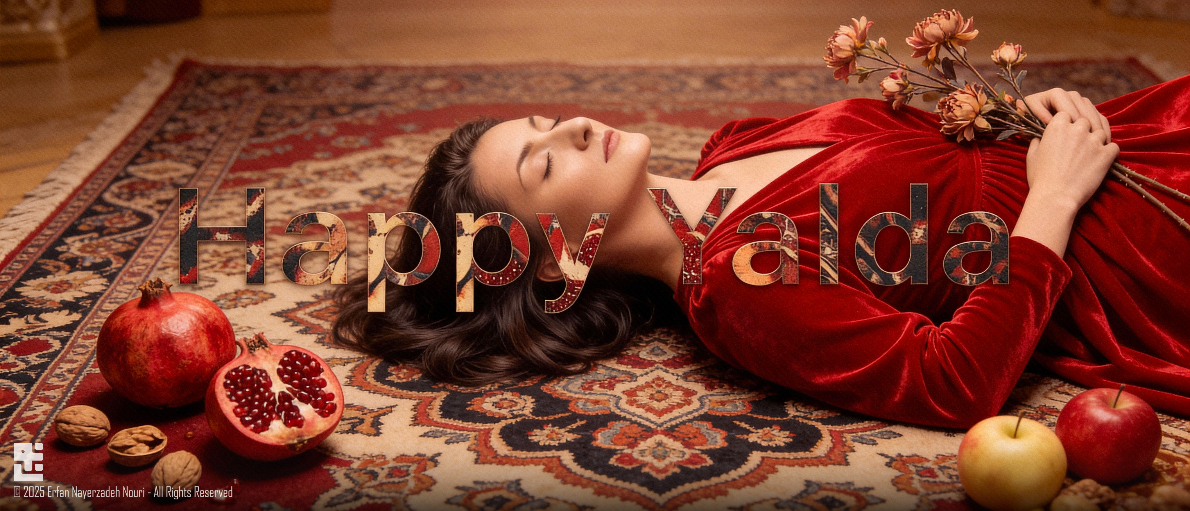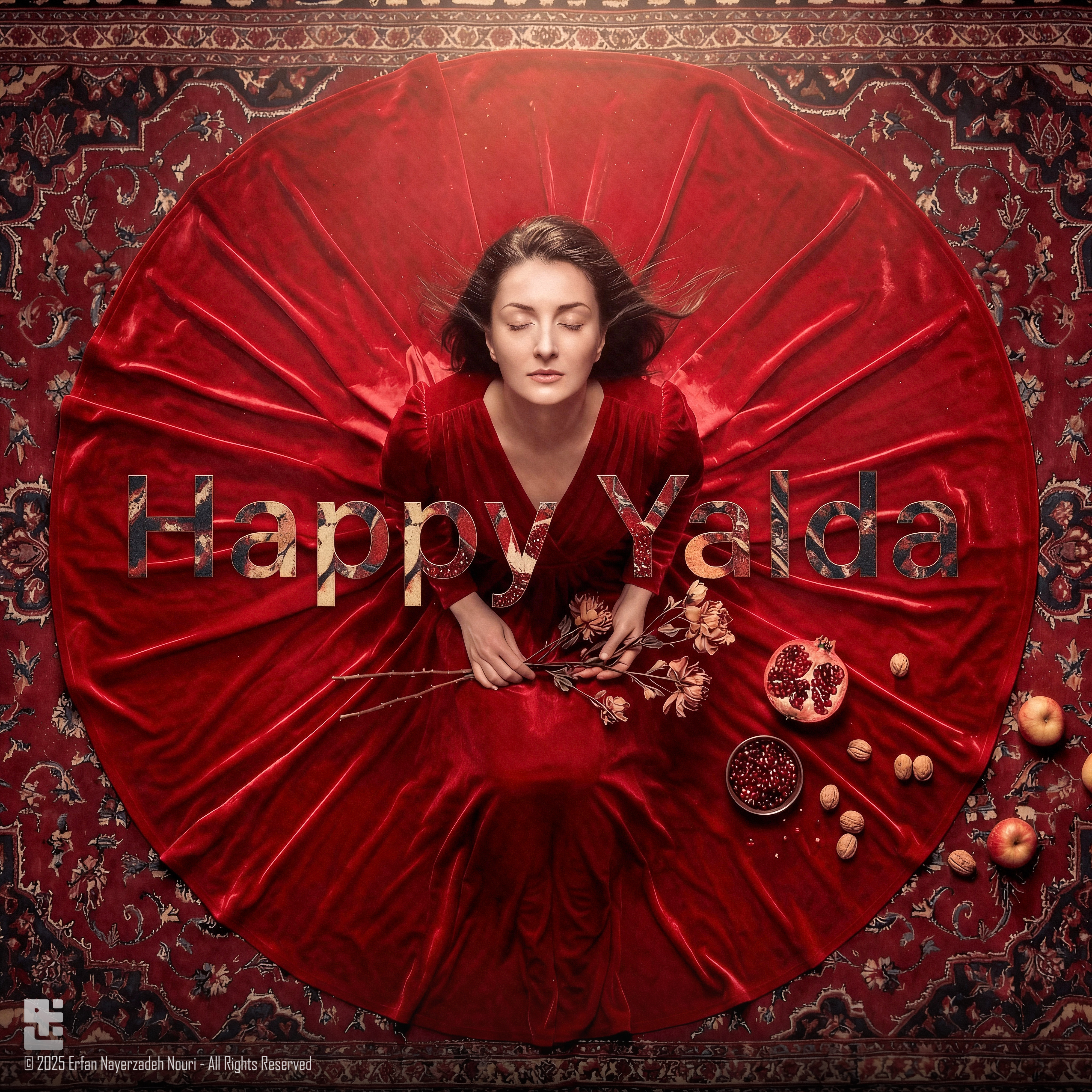 The dominant red palette references pomegranate, warmth, and continuity — symbols deeply rooted in Yalda.