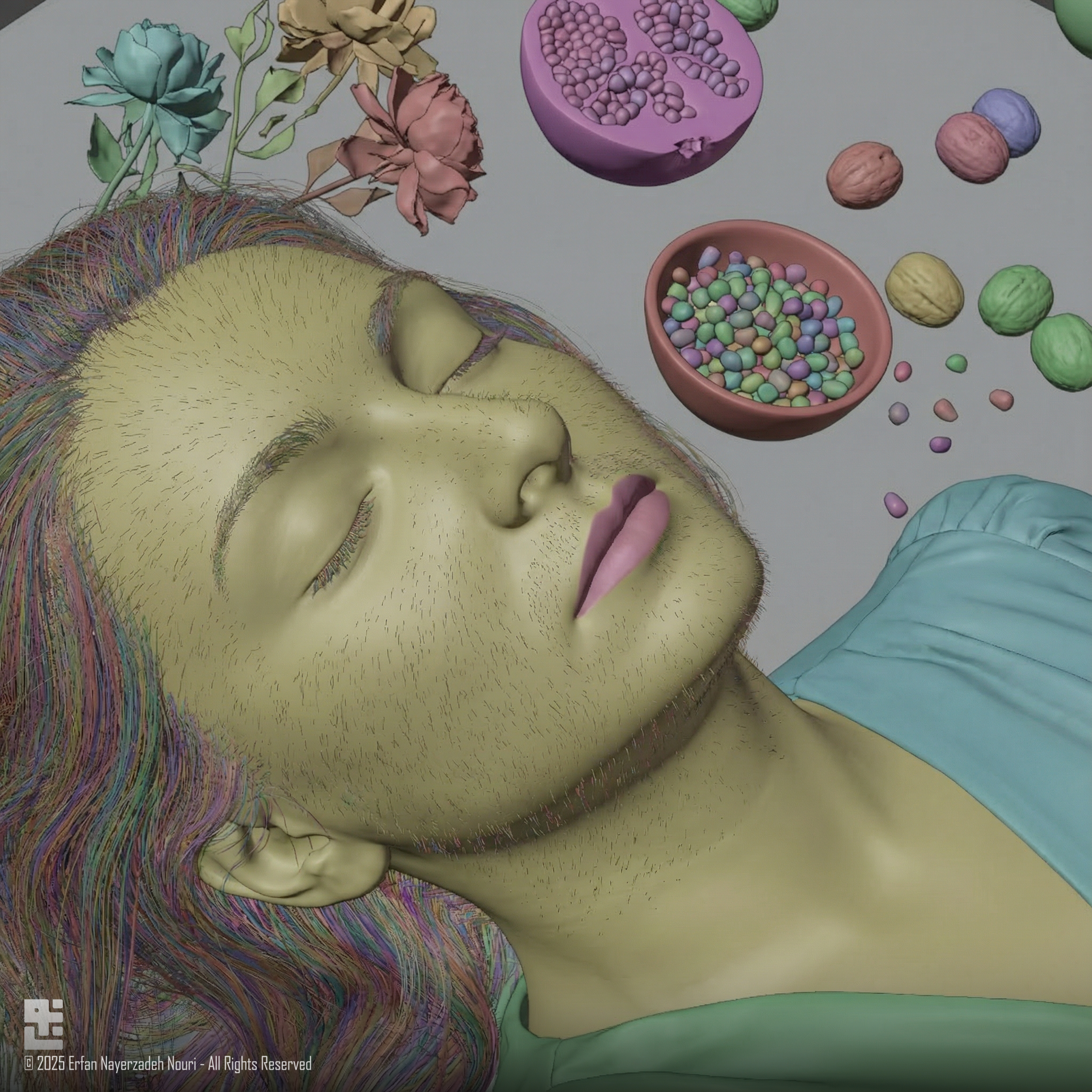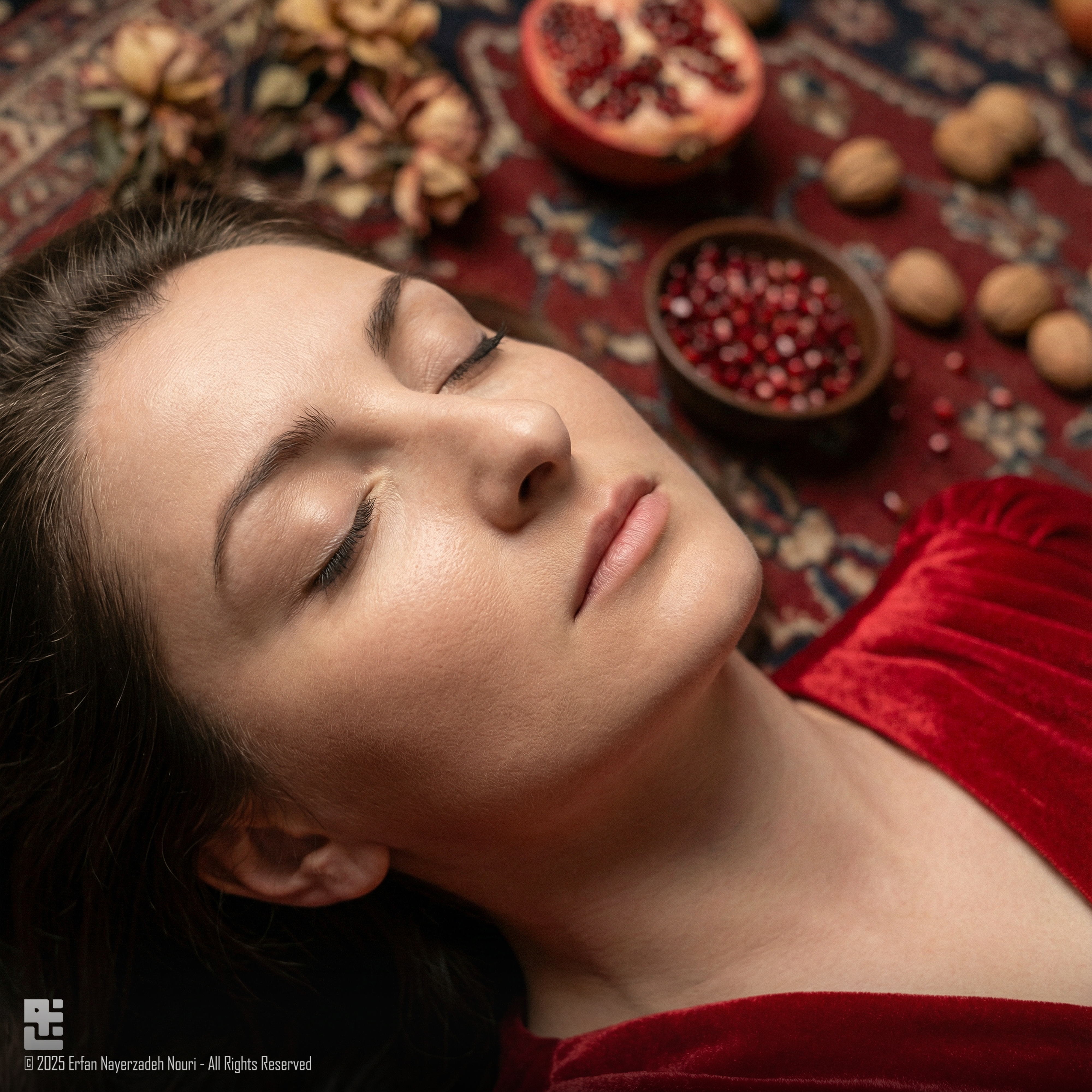 This artwork is a cinematic studio-style CGI portrait inspired by Yalda Night, the longest night in Persian culture.